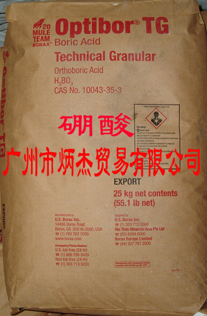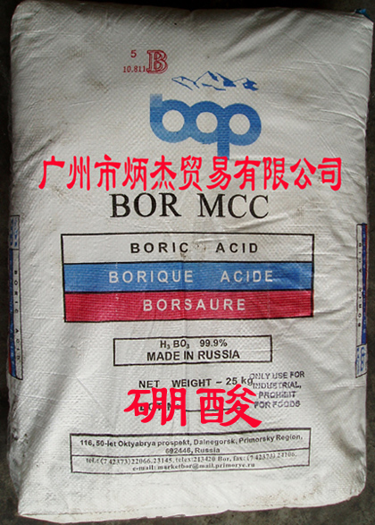 硼酸为无色微带珍珠光泽得结晶或白色疏松的粉末,有滑腻感;无气味,味微酸苦后带甜;水溶液显弱酸性反应;在沸水、沸乙醇或甘油中易溶,在水或乙醇中溶解。在水中溶解度能随盐酸、柠檬酸和酒石酸的加入而增加。有刺激性。