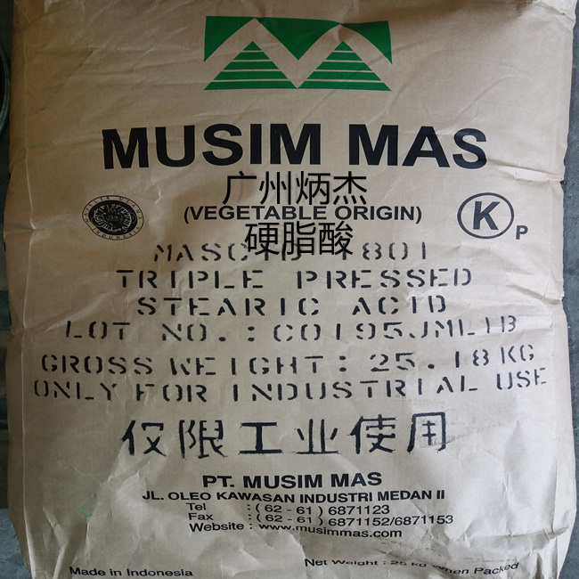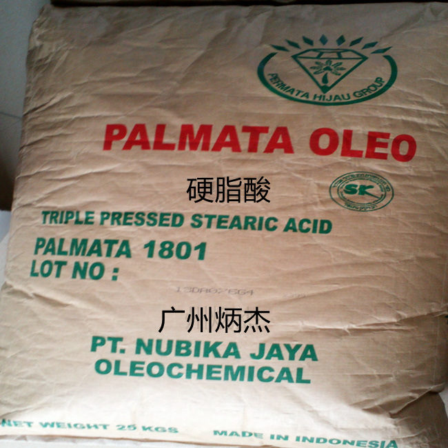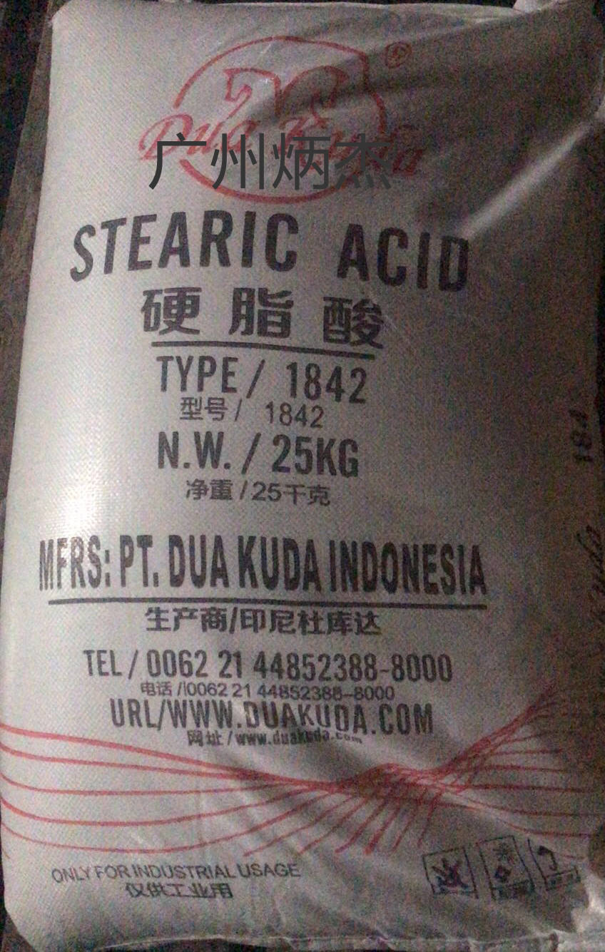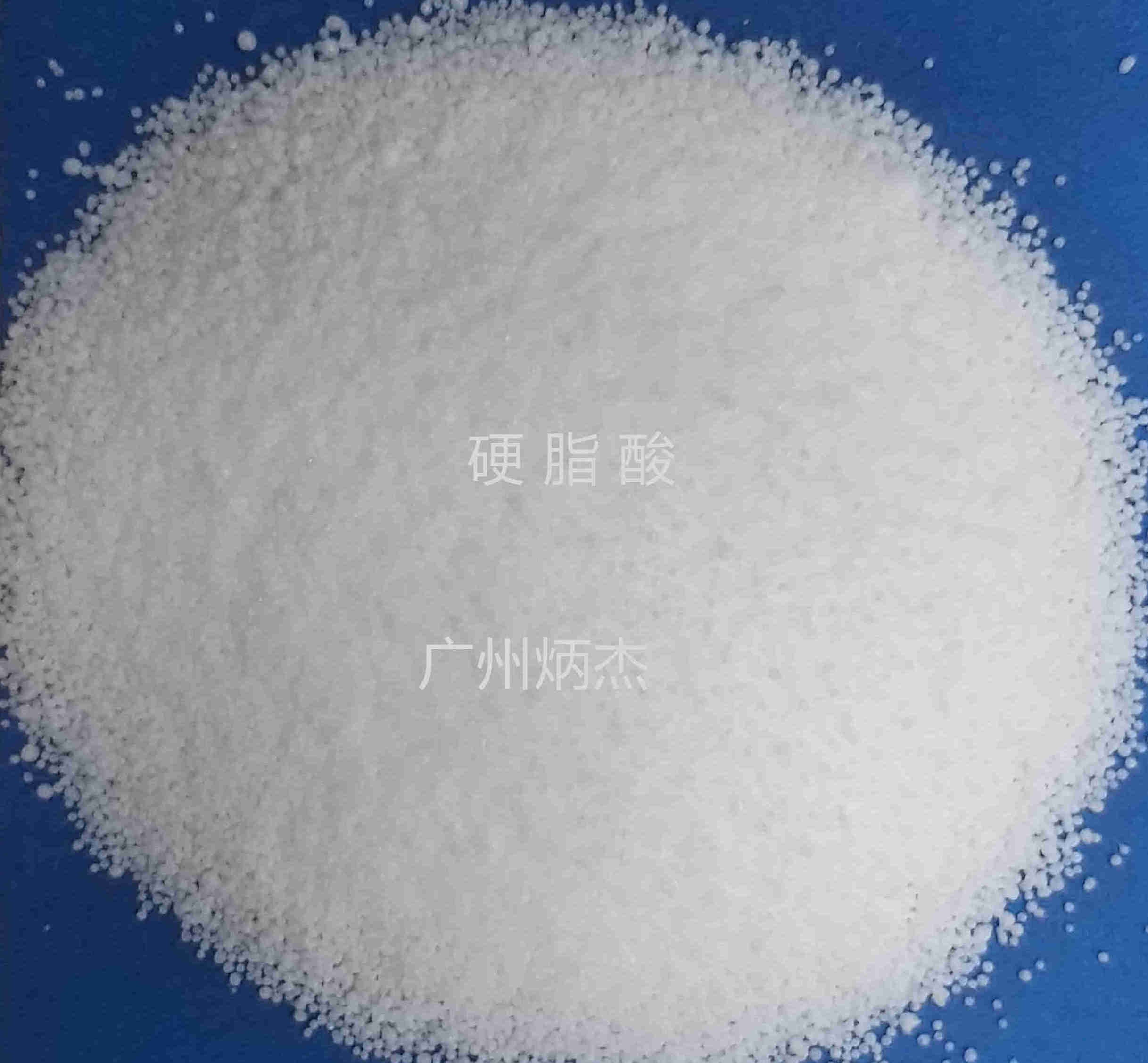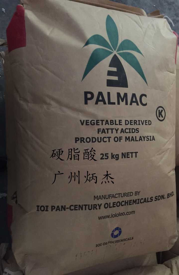 硬脂酸,别名: 十八烷酸、十八碳烷酸、十八酸、脂蜡酸、硬蜡酸、十八碳酸、十八酸合十八酸铁、硬脂酸合硬脂酸按等,为白色蜡状透明固体或微黄色蜡状固体:能分散成粉末,微带牛油气味。不溶于水,稍溶于冷乙醇,加热时较易溶解,微溶于丙酮、苯,易溶于乙醚、氯仿、热乙醇、四氯化碳、二硫化碳。由油脂水解生产,主要用于生产硬脂酸盐。